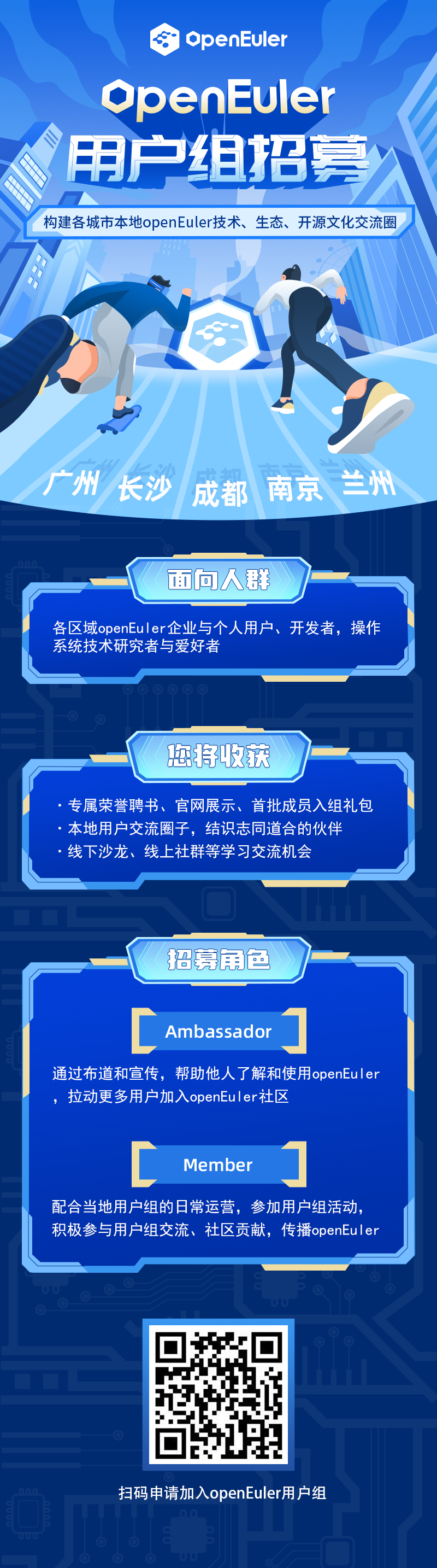 openEuler 作为一个面向数字基础设施的开源操作系统已应用到千行百业,用户群体规模迅速壮大,为帮助各区域的openEuler用户构建本地化交流圈子,openEuler社区城市用户组成员招募启动啦!