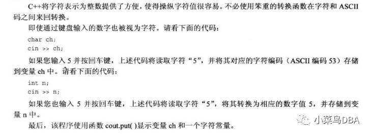 mysql是用c++写的,而在c++中字符类型是存放对应ascii码的二进制到存储空间,而整型数字是直接存数字的二进制,虽然最终都是二进制存储,但是环节上有少许不同,同样在msyql查找时也会有所不同,下图摘自小白版c++教程《c++ primer plus》: