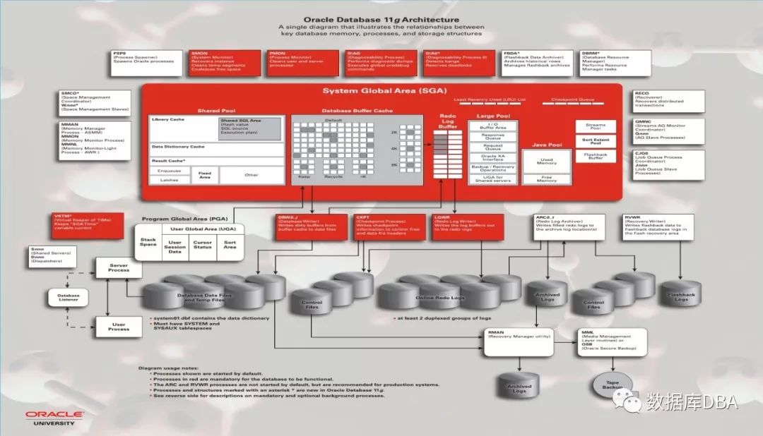 每个Oracle数据库都是由Oracle Instance(实例)与数据库(数据文件,控制文件、重做日志文件)组成,其中所谓实例就是用户同数据库交互的媒介,用户通过于一个实例相连来操作数据库。而实例又是由统一的内存结构(SGA,PGA,UGA)和一批内存驻留进程组成。实例在操作系统中用ORACLE_SID来标识,在Oracle中用参数INSTANCE_NAME 来标识,它们两个的值是相同的。