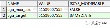 SELECT NAME, VALUE, ISSYS_MODIFIABLE FROM V$PARAMETER WHERE NAME LIKE'sga%';