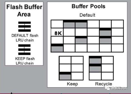 Oracle对于buffer cache的管理,是通过两个重要的链表实现的:写链表和最近最少使用链表(the Least Recently Used, LRU)。写链表所指向的是所有脏数据块缓存(即被进程修改过,但还没有被回写到数据文件中去的数据块,此时缓冲中的数据和数据文件中的数据不一致)。而LRU链表指向的是所有空闲的缓存、pin住的缓存以及还没有来的及移入写链表的脏缓存。空闲缓存中没有任何有用的数据,随时可以使用。而pin住的缓存是当前正在被访问的缓存。LRU链表的两端就分别叫做最近使用端(the Most Recently Used ,MRU)和最近最少使用端(LRU)。