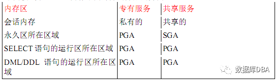对PGA内存的管理和分配,很大程度上依赖与服务模式。下面这张表显示了在不同模式下,PGA内存不同部分的分配的异同: