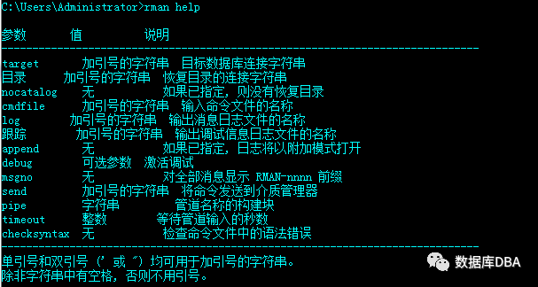 在OS 提示下简单的输入rman命令就可以启动RMAN。一旦启动了RMAN命令解释程序,就可以执行任何所需的操作。RMAN总是以SYSDBA身份连接目标数据库,所以连接账户必须具有SYSDBA权限。 具体用法参考帮助: