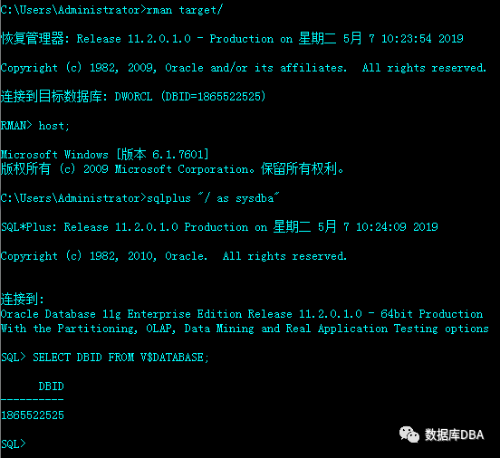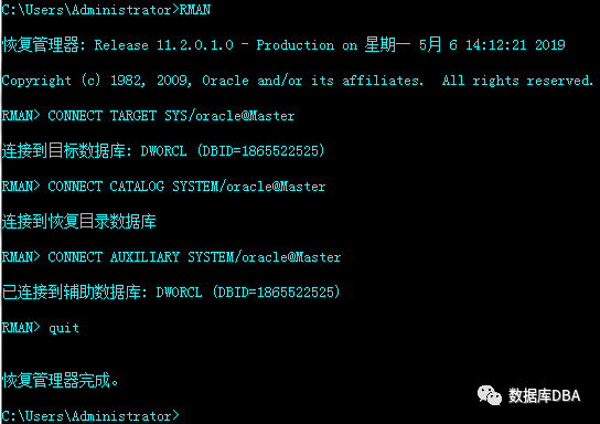 连接到目标数据库: DWORCL (DBID=1865522525)
