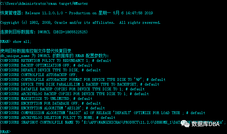 C:/Users/Administrator> RMAN TARGET RMAN/RMAN@Master;