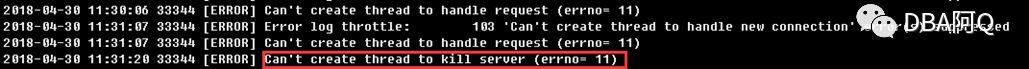 重启mysql服务,执行没响应,kill -9 mysql进程,从errorlog中看到,停服务的命令由于无法创建新的thread导致执行失败