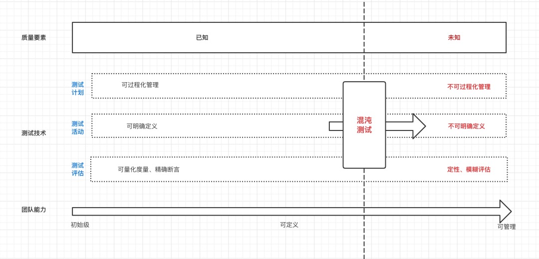 因此,在MO的测试体系中,让当前产品关注的质量要素可被更多的感知、管理和评估的所有测试努力,都属于混沌测试。混沌测试并不是什么新的测试技术、或者颠覆性的测试理念,它依旧需要遵循软件测试的本质,那就是为产品的商业活动提供质量信息和信心,所以,混沌测试的终级目标就是让“混沌”变得“不混沌”。