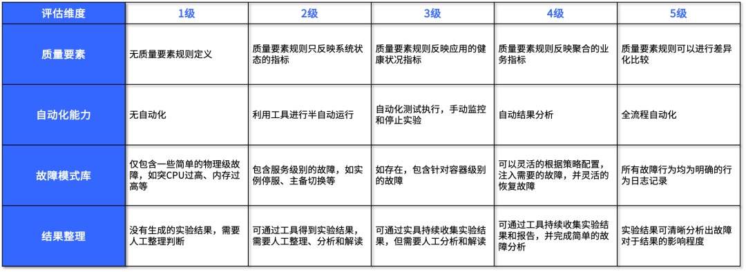 关于混合评估混沌测试成熟度,目前业界已经有一些探索,比如阿里的CMM模型,但是此模型有些过于复杂和理论化,MO测试团队基于此,定制了属于自己的一套评估模型,而整个混沌测试的开展和演进,也是再此模型的基础上进行的。