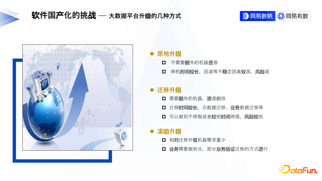 原地升级,不需要额外的机器资源,但需要停机升级,错误回滚是一个很大的问题。 迁移升级,重建一套系统,然后将数据拷贝过去。这种迁移可以做到不停服务,对线上系统无感知,但是需要额外的机器资源,成本及时间支出较高。 滚动升级,滚动升级需要对业务做一些拆分,然后基于业务部分迁移。这种方式相对迁移升级来说,对资源的需求相对更少,是一个对成本控制和业务影响相对稳妥的方案。