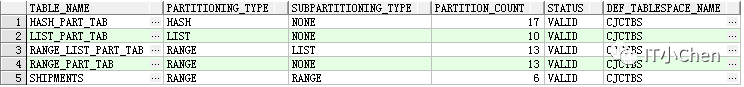 select table_name,partitioning_type,subpartitioning_type,partition_count,status,def_tablespace_namefrom user_part_tablesorder by 1;