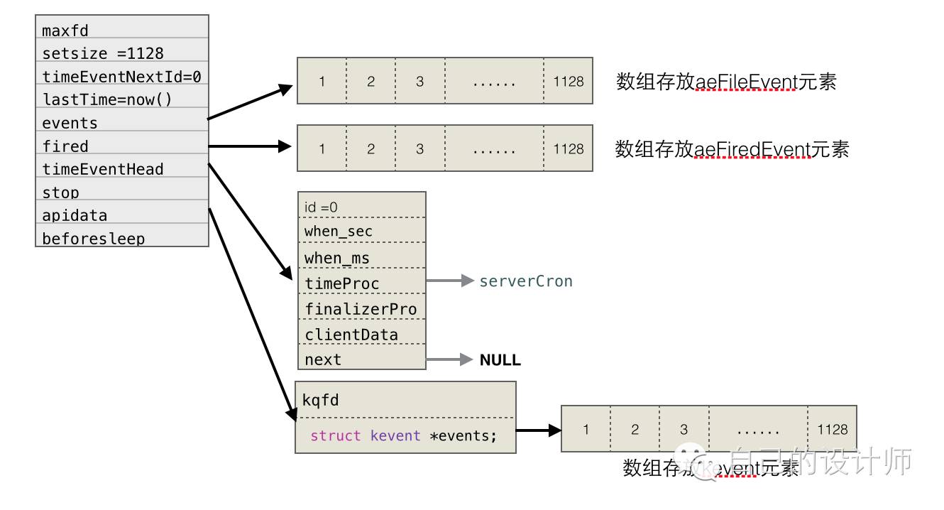 从上面我们可知,经过aeCreateEventLoop的初始化,一个EventLoop基本成型了,包含一个1128个aeFileEvent元素的数组和一个1128个aeFiredEvent元素的数组。 同时,通过kqueue(mac上的实现,linux上对应为epoll)初始化了一个文件句柄池,后续需要将相应的socket只要挂到kqfd下,就将相应的文件事件注册到了EventLoop中了。