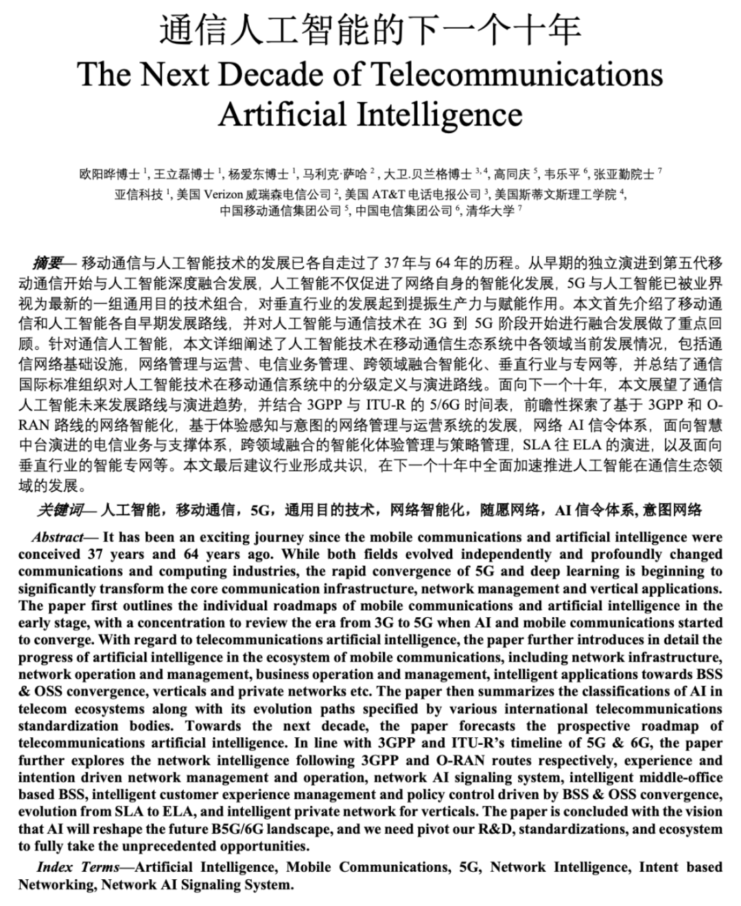 近日,亚信科技(AsiaInfo Technologies)联合工业界与学术界伙伴,中国移动(China Mobile)、中国电信(China Telecom)、Verizon、AT&T、Stevens Institute of Technology和清华大学(Tsinghua University)共同撰写并发布了《通信人工智能的下一个十年》(以下统称“本文”)。本文回顾并综述了移动通信与人工智能在过去近40年发展与融合的历程,并对人工智能在下一代移动通信未来10年发展前景做出前瞻性分析与展望,是通信产业界第一篇系统性阐述通信技术与人工智能技术融合演进的文章。本文作者们是移动通信与人工智能领域的资深专家。谨以此文,对过去数十年通信行业中为通信人工智能领域做出贡献的同仁们致以由衷的感谢,并期望产业界紧密携手,为通信人工智能在未来10年的融合发展做出更大的贡献。本文中文版已在2021年4月中国科技核心期刊《电信科学》发表,长按文末二维码填写表单可获取本论文电子版。本文英文版随后即将发表。图1 《通信人工智能的下一个十年》摘要