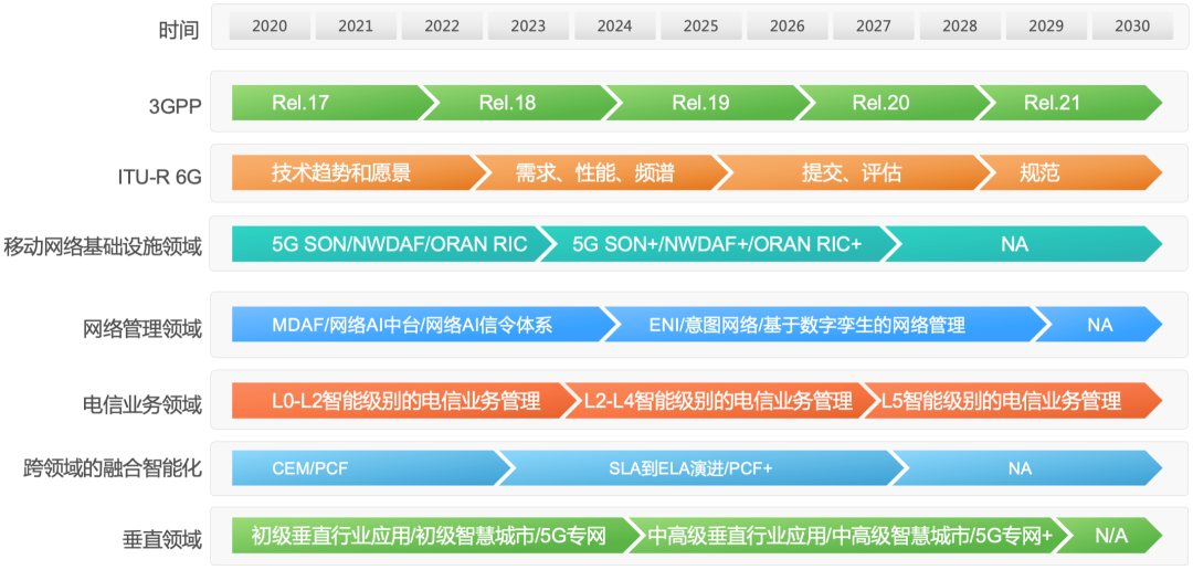 针对通信人工智能未来10年的发展路线与演进趋势,本文结合3GPP与ITU-R的5/6G时间表,前瞻性地探索了网络智能化的新部件例如NWDAF、SON、O-RAN RIC等在通信网络基础设施领域的发展应用;网络AI新技术例如MDAF、网络AI中台、网络AI信令体系、随愿网络、ETSI ENI 网络体验与感知体系,网络数字孪生技术在网络管理与运营领域的发展应用;基于人工智能平台板块的智能客服、智能营销、智能推荐等在电信业务与支撑领域的发展应用;基于联邦学习的CEM、ELA体系在跨BSS与OSS领域的融合智能化演进;以及基于人工智能的5G专网切片SLA保障、切片资源智能调度与优化、无线专网覆盖与性能优化、AIOps等在垂直行业专网的发展应用等。图4 通信人工智能的未来10年展望总结