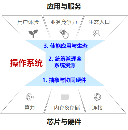 操作系统是软硬件系统的中枢,向上要支持应用与服务,包括提升用户体验、提高业务竞争力、提供生态入口。向下需抽象并管理相关硬件,其核心挑战是如何统筹全系统资源。