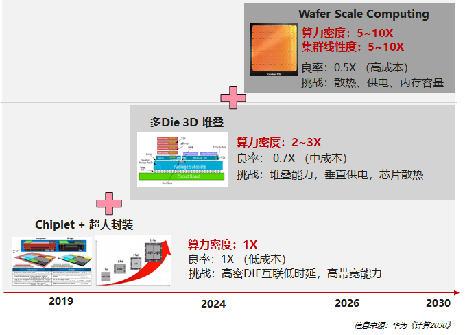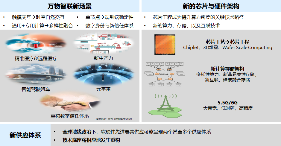 随着 Chiplet、3D 堆叠、Wafer Scale Computing 等芯片技术的出现,芯片工艺可能会演变为芯片工程,成为提升算力密度的关键路径;还有新的计算存储架构,包括多样性算力、新非易失性存储、新互联、硅碳融合存储等;此外,5.5G/6G 的大带宽、低时延、高密度、高精度的互联通信也会使能新的场景。