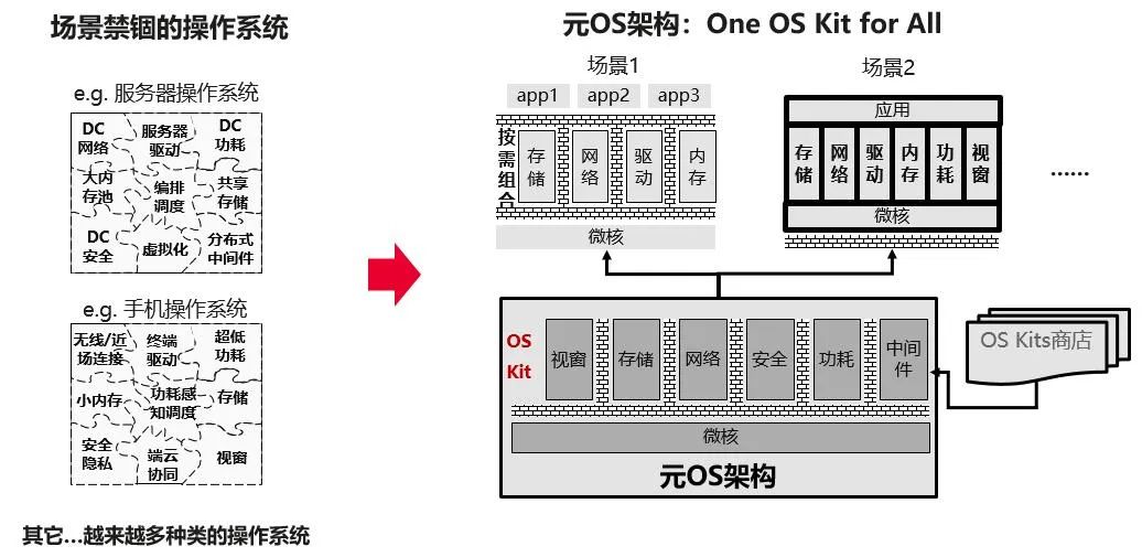 我们提出了元 OS 架构来缓解这个问题。通过一个操作系统去适应所有场景,即“One OS for All”,已被证明是十分困难的。但如果将操作系统进行一个有效的解耦/元化,将系统组件 kit 化,实现“One OS Kit for All”。这样在面向多场景的不同需求时,可将kit进行有效的组装,来解决多场景能力共享、生态互通、极简互联、按需组合等问题。当然,元 OS 架构有很多的技术挑战。例如如何对操作系统的状态进行有效管理,如何在解耦后保障其性能等。