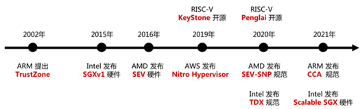 简单来说,机密计算架构 (Confidential Compute Architecture, CCA) 是重构数字信用体系中一个很重要的软硬件架构。早在 2002 年,ARM 就提出了 TrustZone 的概念,到现在正好 20 年。当前 TrustZone 基本在 ARM 体系里,包括手机、车、电信设备等等,华为构建的 iTrustee 安全操作系统也已布局在公司的各大平台上。此外,2015 年 Intel 发布了 SGXv1,2016 年 AMD 推出 SEV,2019 年 AWS 也在软硬件设计上进行一些使能和推广,云上也出现了 Confidential VM 这样的新形态,RISC-V 上也有 KeyStone、Penglai 等新的机密计算架构。