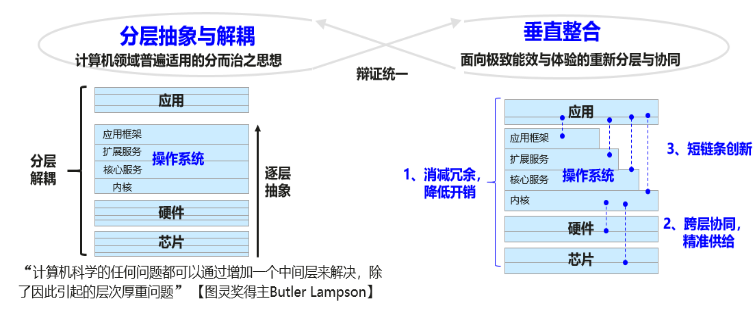垂直整合和分层解耦看似是两种不同的方法论,但实际是辩证统一的。分层抽象和解耦,是计算机领域普遍适用的分而治之思想。图灵奖获得者 Butler Lampson 提过这样一个大家熟知的理念,即“计算机科学的任何问题都可以通过增加一个中间层来解决”(其实是增加一个抽象来解决),但他后面还讲了一句话大家都常常忽视,“除了因此引起的层次厚重的问题”。我们可以看到,过去 IT 系统的发展主要是逐层抽象、分层解耦的方式。