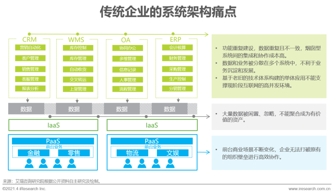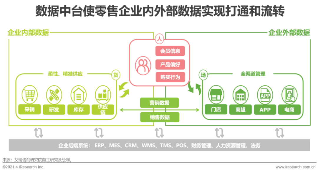 在信息化建设过程中,零售企业积累建设了包括ERP、MES、CRM、WMS、TMS、POS等在内的各种业务系统,而随着线上线下各种零售渠道的涌现,线下门店、自有商城、电商平台、社交软件平台等渠道也带来大量碎片化的数据。业务系统的割裂和渠道的分散逐渐暴露出弊端,即无法通过统一的会员数据管理搭建全场景的消费者画像以实现精准营销,无法实时更新“进-销-存”数据并与营销数据结合以实现智能化的数据分析。