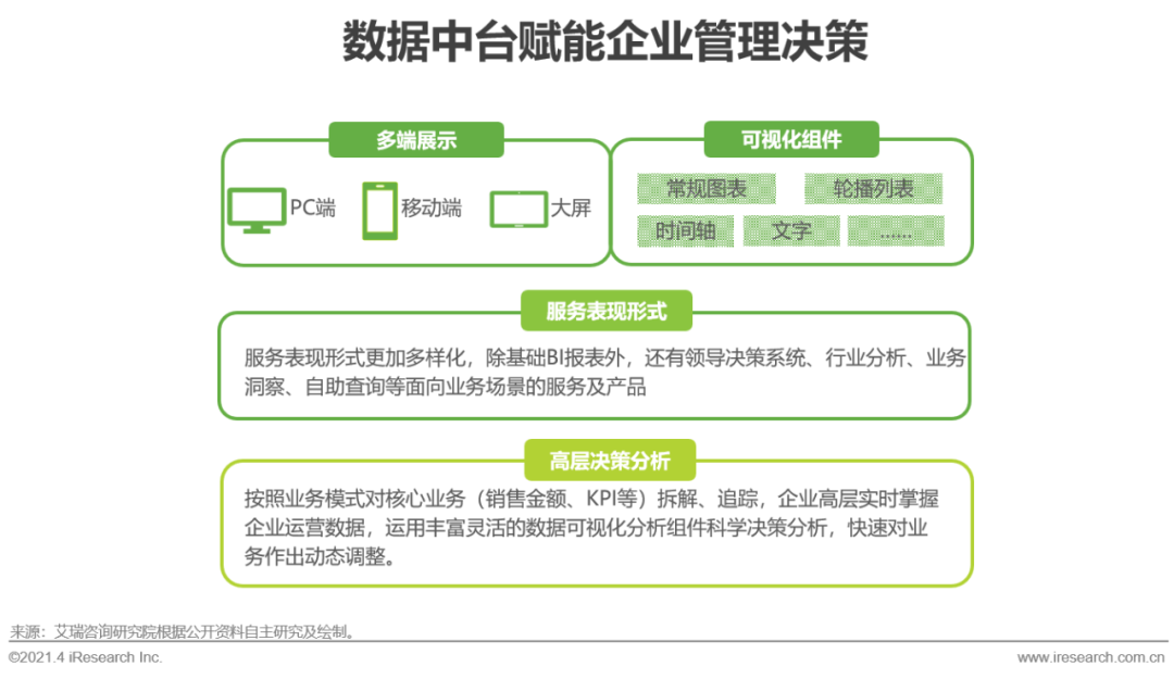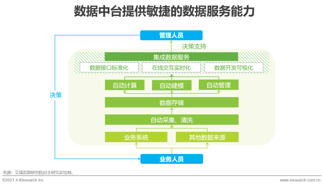此外,数据中台匹配和衔接了当前业务与数据间协作的需求,形成价值链闭环。在实现数据接口标准化和在线交互实时化的基础上,集成可快速复用的数据生产力工具或模块,使数据具备敏捷地对外服务的能力,智能服务全流程的部门及人员,使每个层级的员工都能快速制定适合自己的数据决策服务,有效赋能业务决策。