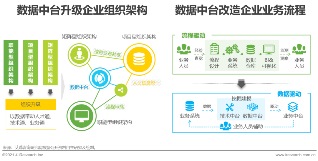 传统的作业方式通常呈现“流水线”的特点,往往由业务人员基于行业经验进行流程设计,结合商业套件建立和操作业务系统。数据仅仅是用于监测业务进展和洞察规律的副产物,最终的决策由业务人员进行,因此决策不确定性较强,整个业务流程的迭代速度极慢,很难与当前快速变化的前端应用匹配。而随着数据中台在整个业务链条中的部署和应用,大数据进入决策阶段,企业的业务流程也逐渐快速、扁平化,由原先依赖业务人员经验的流程驱动逐步转向数据驱动。