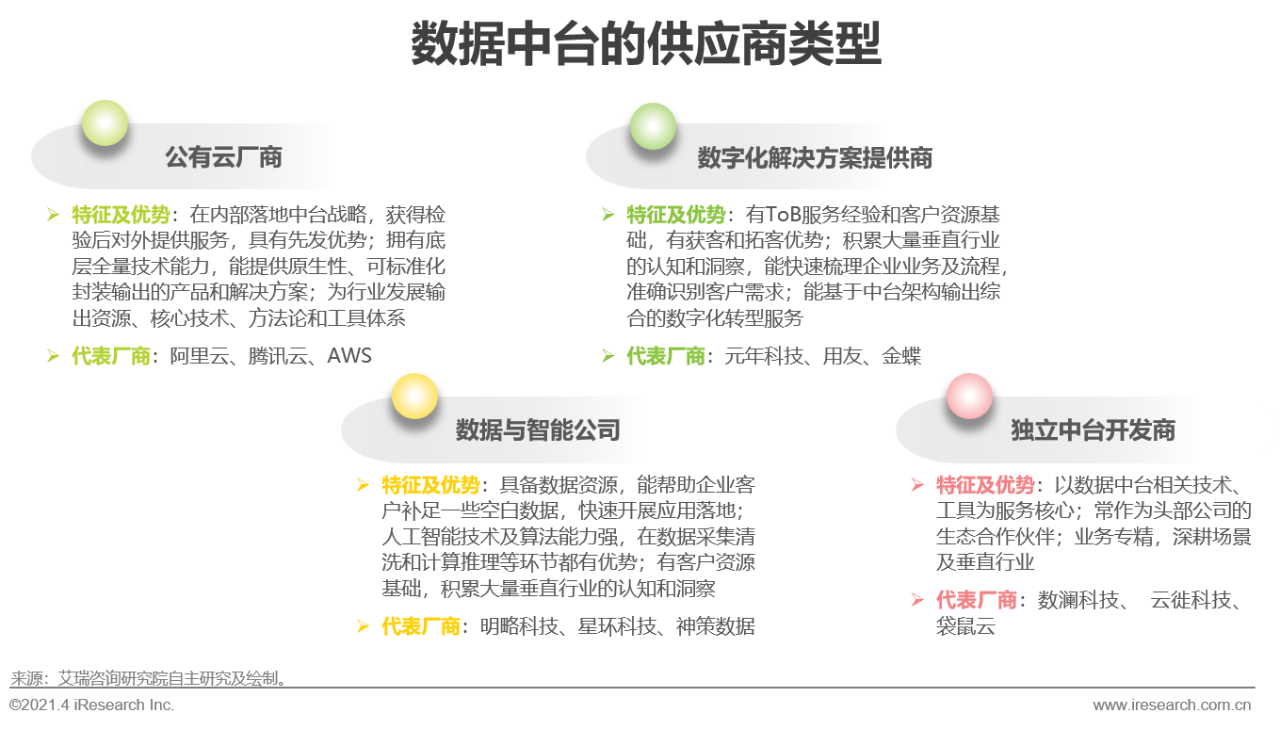 数据中台供应商主要由五类厂商构成:头部互联网企业、数字化解决方案提供商、大数据公司、独立中台开发商及人工智能厂商。市场不断有新玩家进入,各类型的厂商都具有不同的竞争优势,处在占领市场份额、凭借优势领域构建进入壁垒的扩张阶段,与此同时也带来了一些产品区分度低、边界不明、业务混杂等行业乱象。