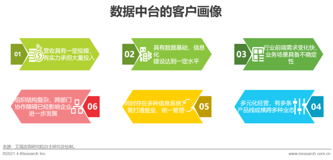 我们认为,满足以下至少三种情况的公司适合进行数据中台的部署:①业务场景具备不确定性,迭代速度快,所处市场环境变化快,需要具备快速试错和敏捷反应的能力;②生态和流程系统复杂,有多条产品线或横跨多种业态,各业务单元间存在功能模块低水平重复建设的问题;③由于事业部等的组织架构,导致数据和信息系统存在互联互通问题,需要打通壁垒进行统一管理;④营收具有一定规模,信息化建设达到一定水平,但信息技术仍对企业发展存在制约,需要进行整体的技术升级、业务重构;⑤对外需要多业态扩张,多消费渠道触达,希望协调整个产业链上下游合作伙伴之间资源。