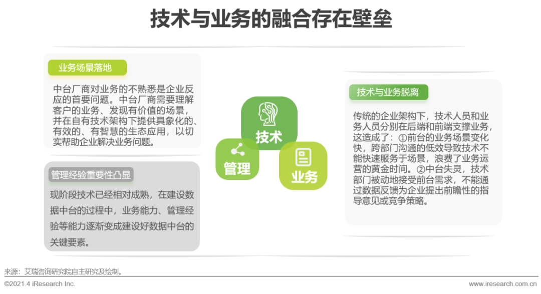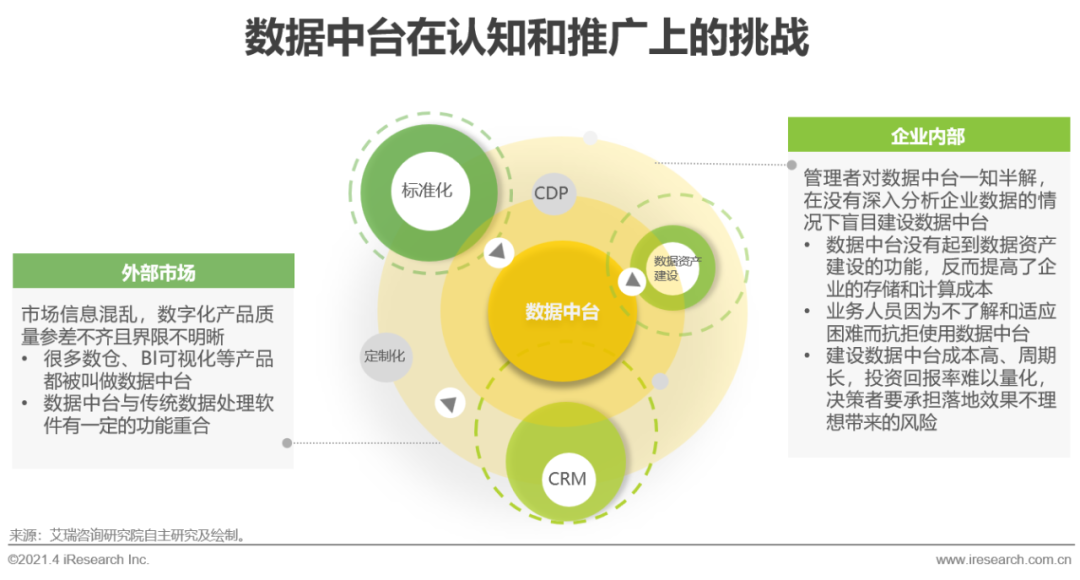 而从市场环境来看,数据中台外在表现为偏定制化的解决方案,它们涉及不同的应用领域、覆盖不同的生产环节,很难有一套面对全行业、全领域通用的中台产品,因此企业对数据中台的认知非常依赖市场内正确信息的传递和头部企业的成功案例示范。整体而言,认知和推广仍是数据中台应用的挑战,这需要供应商和企业长期共同协作来解决。