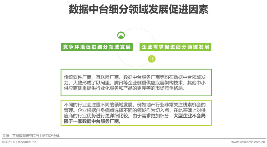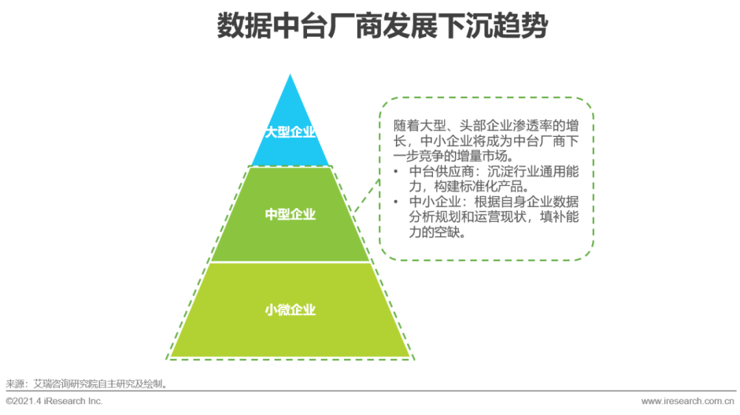 数据中台的核心在于共享和沉淀能力,随着数据中台在行业头部及领先企业逐渐落地,供应商经历了各类业务场景能力沉淀的过程。在深度上,数据中台厂商承载细分行业的各类定制化业务,不断沉淀业务能力。在广度上,随着不同业务场景的持续输入,数据中台厂商产品的能力越来越丰富,覆盖的领域也越来越广泛。完善数据中台的深度和广度,提炼和整合数据中台的服务,尤其是对于对数据中台能力要求相对简单的中小企业,为客户提供标准化的整体解决方案将成为数据中台服务商的产品方向。
