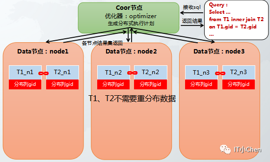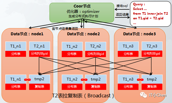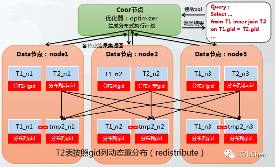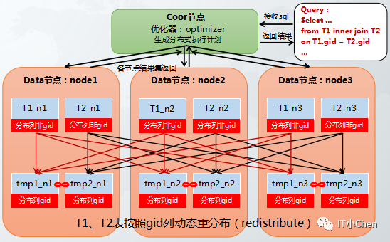t1,t2两个hash分布表进行关联,其中关联列都不是t1,t2的hash分布列,T1表和T2表都按照gid做hash重分布,重分布后再分布式各节点执行join