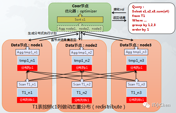 场景:hash分布表在执行group by操作时,分组的列中不包含hash分布列,需要动态重分布或二阶段group by,效率较低,具体执行动态重分布还是二阶段group by受参数gcluster_hash_redistribute_groupby_optimize控制。动态重分布是将group by后的第一列作为hash分布列,动态生成hash分布表,在进行group by操作。