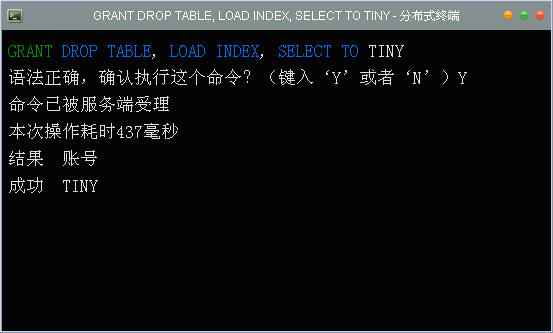 管理员向一个名为“TINY”的用户授权,使他获得删表、加载索引,SQL SELECT检索的能力