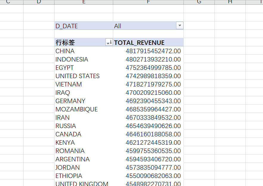 如下图,某公司的财务人员想查看当前所有订单中部分国家地区消费者的营收情况,可以通过 Excel 快速实现目的。