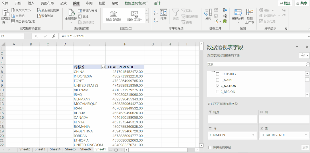 所有准备工作完毕,接下来就可以进行明细钻取了。在文章开头,我们已经发现了少量数据集的情况下存在部分不符合预期的业绩明细。现在在 600w 数据量的情况下,也可以一样地去分析不同国家之间的业绩。