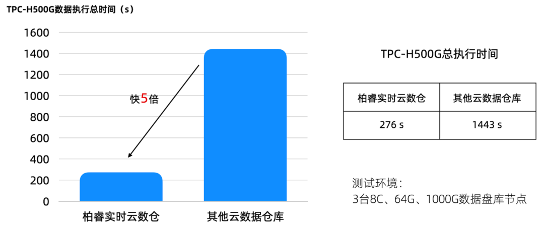 柏睿数据实时云数仓由云管理平台、全内存数据库和数据库管理Portal三个逻辑部分组成。实时云数仓使用微服务架构,能通过DB集群在线弹性伸缩节点数量,实现集群性能的调整。使用500GTPC-H测试并与其他云数仓产品对比时,能够发现数据执行总时间加速5倍。在单节点最小规格下进行TPC-H测试,也能表现出优秀的性能。