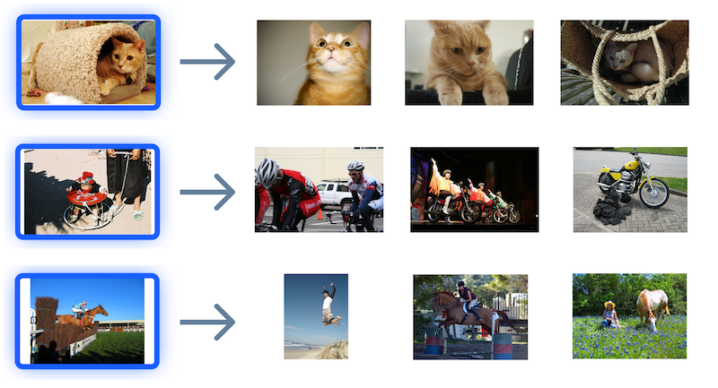 准备工作:训练模型,针对数据进行预处理,将图片全部编码为向量并进行储存。 第一步:获取目标图片的嵌入向量。 第二步:在向量数据库中找到距离最近的向量,收集向量的 ID。 第三步:根据检索到的结果,返回对应向量 ID 所代表的图片。