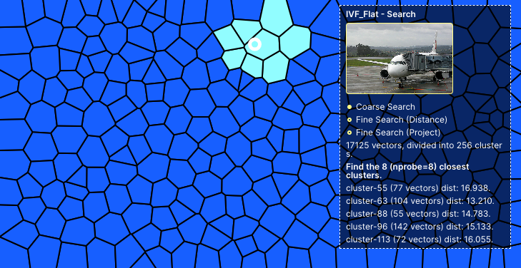 如果我们使用传统的 FLAT 类型的索引,想要完成相同的检索,至少需要计算一万七千次,完成整个向量数据库的遍历。而当我们使用了 IVF_FLAT 索引之后,根据上文中的参数配置,我们只需要进行不到一千次的计算:包含了粗略查询 256 次,以及后续的精细查询 742 次左右,能够大幅提升我们对于检索效果的获取速度。