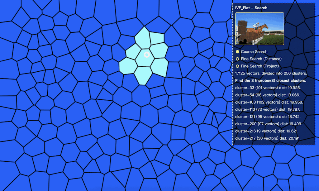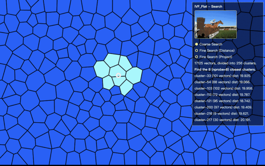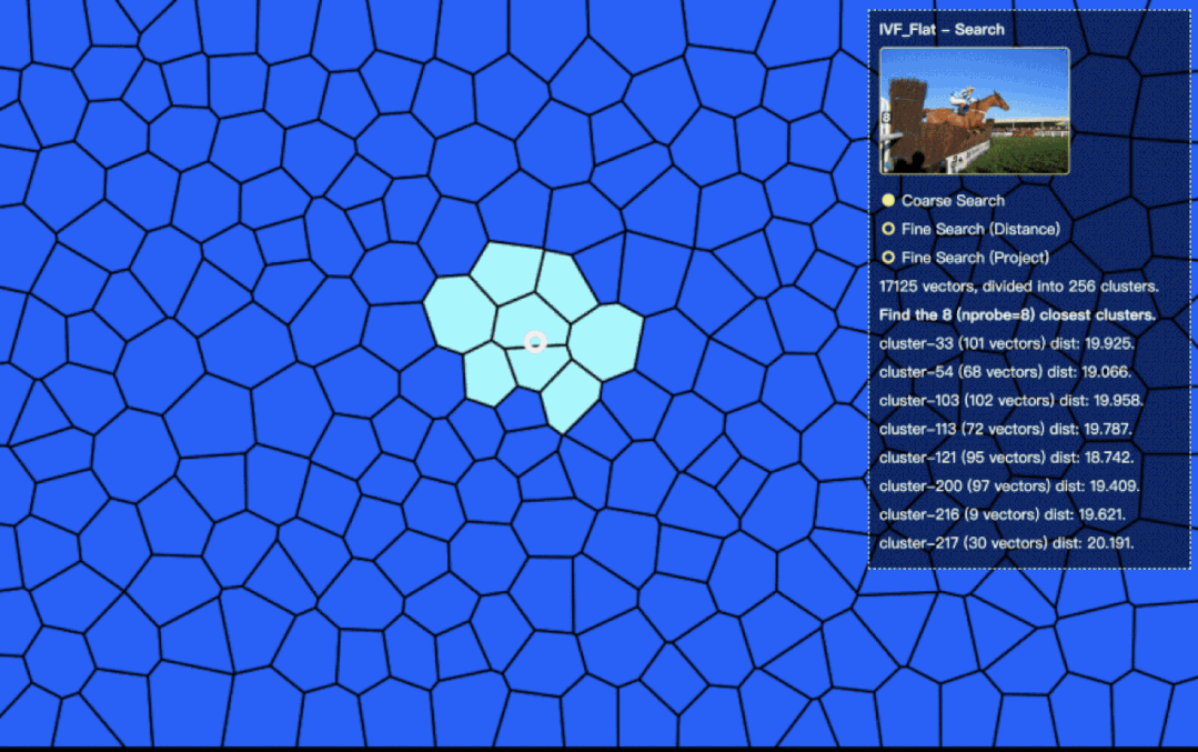 ,将检索范围从 17000 张图片所在的 256 个区域,缩减为最相似的八个聚类中(图中高亮的区域)。在粗查询过程中,我们一共进行了nlist