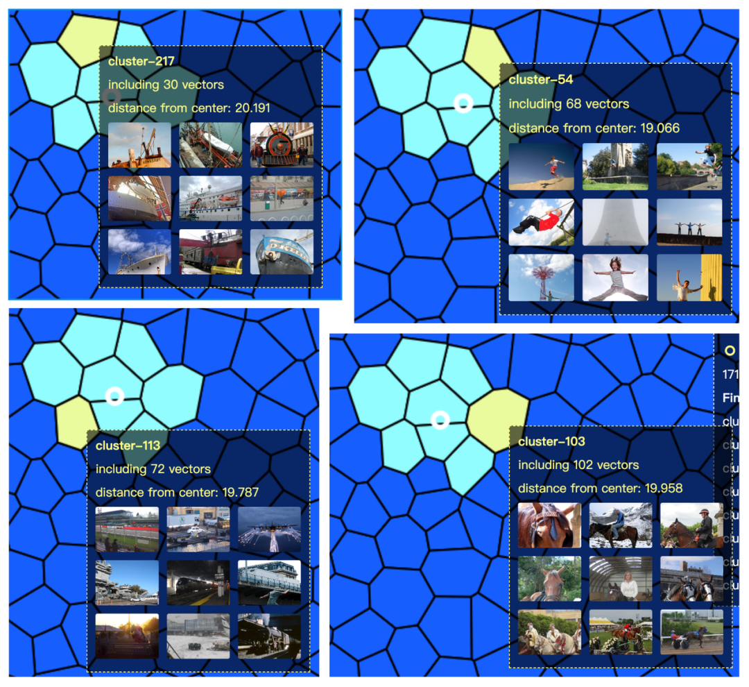 如上图所示,我们将不同的聚类使用不同的颜色来进行区分,可以观察到这些聚类中的向量的具体空间分布。其中,每个向量节点距离中心的距离映射了该向量与我们要检索的目标向量的实际距离。