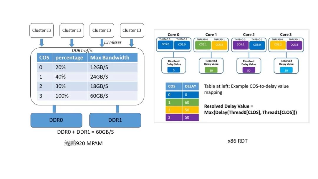 图 2 MPAM 和 RDT L3 Cache 控制方式异同 如图 2,MPAM 规定配置 Cache 主要有两种方式,一种是通过优先级配置,这种情况下,优先级高的业务流将优先使用 Cache 的使用权;第二种是以 Cache way 为粒度,按照 bitmap 形式隔离不同业务对 Cache 的使用,不要求 Cache way 分配连续,这也是目前鲲鹏 920 采取的控制方式。x86 RDT 目前仅支持第二种,且大部分型号要求 Cache way 分配连续[6]。图 3 为鲲鹏 920 和常用 x86 型号 RDT 特性对流量控制的比较,对比其他架构的类似特性,MPAM 在流量控制上的最大特点是参考当前 DDR 通道的传输能力,从而对业务流限制一个明确的上下限,若当前受控流量超过该 DDR 通道设定百分比对应的上限流量时,则限制到该百分比以下,同时在小于下限流量时享有优先访问权。对比 x86 RDT,其限制流量的动作发生在 L2 和 L3 之间,使用给受控流量主动加时延的方式降低目标流量[6]。图 3 鲲鹏 920 MPAM 与 x86 RDT 流量限制上的异同 除此之外,MPAM 协议规定了额外两种流量控制方式,如图 4 所示,一种是采用 bitmap 的方式完全隔离开不同的业务流,被隔离的业务流将会按照 bitmap 划分的时间片分区间轮询使用访存通道;第二种,在第一种方式的基础上,还可使用优先级方式调整业务流的优先级,在发生访存拥挤时,同一时刻高优先级业务流将优先享有该 DDR 通道。