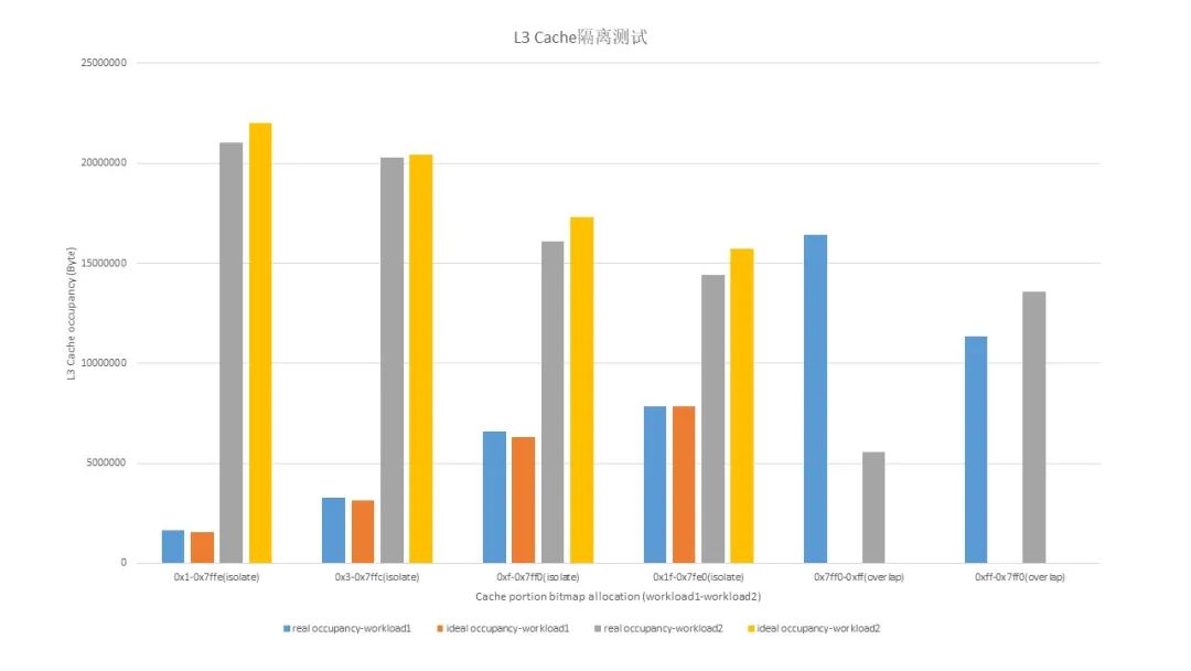 如图 6 所示,启动一个 workload,workload 也可自行选择,对 L3 Cache 按 cpbm 分配,通过 MPAM 的 monitor 查看 workload 占用的 L3 Cache 容量变化,可见 workload 真实占用的 Cache 容量和理论大小基本一致。图 7 实验二 MPAM 双 workload Cache 隔离workload1: numactl –m 0 stress-ng –cache 10 --aggressive