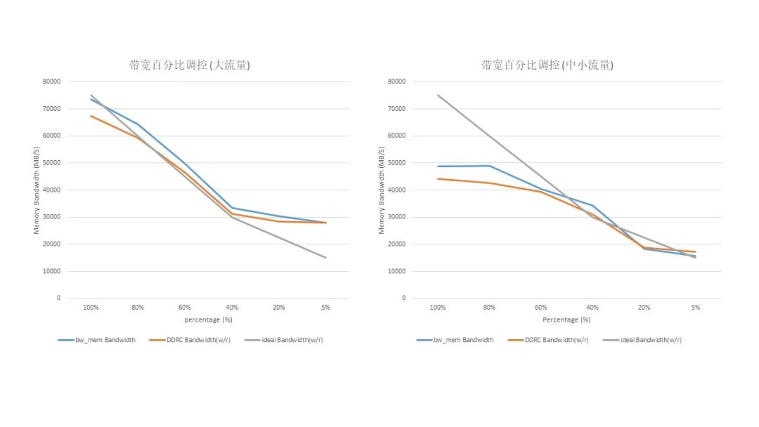 如图 8 所示,在大流量下和中小流量下(当前 DDR 通道最大带宽约为 75MB/S)对带宽做最大百分比调控,通过 MPAM monitor 查看 workload 对应流量大小变化,可见流量控制效果基本与预期相符,鲲鹏 920 上 MPAM 设定的带宽控制有效百分比约在 20%-80%。spec CPU 2006 测试
