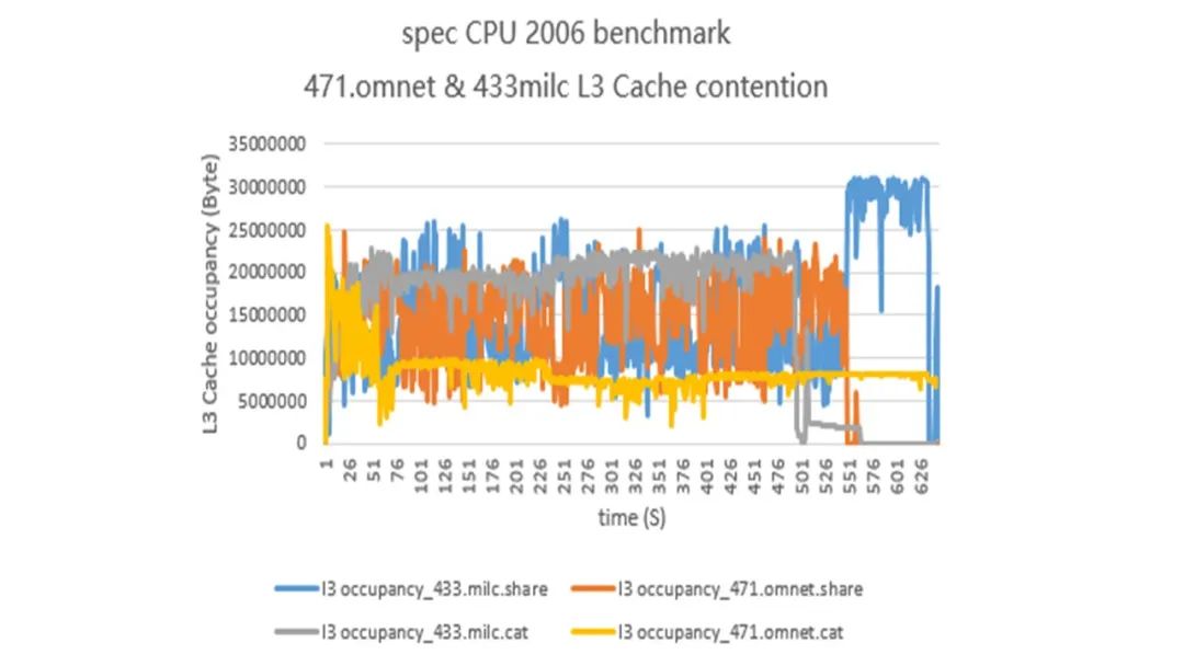 选用 spec CPU 2006 omnet 测试套和 spec CPU 2006 milc,分析 Cache 干扰:cpu+内存型业务混合部署场景下,通过 CPBM 隔离 L3 Cache 可以削弱不同业务对 Cache 的竞争,提升性能,如图 9 所示,非隔离时两种业务之的 Cache 实际占用大小波动非常大,这是造成性能下降的主要原因。图 9 MPAM spec 2006 L3 Cache 隔离测试[9] 通过对两组业务的 Cache 进行完全隔离,可以看到隔离后的业务 Cache 实际占用大小波动明显减少,对比不做隔离的情况,omnet 业务最终获得了 10+%的性能提升,milc 业务性能也略有提升。DPDK 隔离带宽干扰