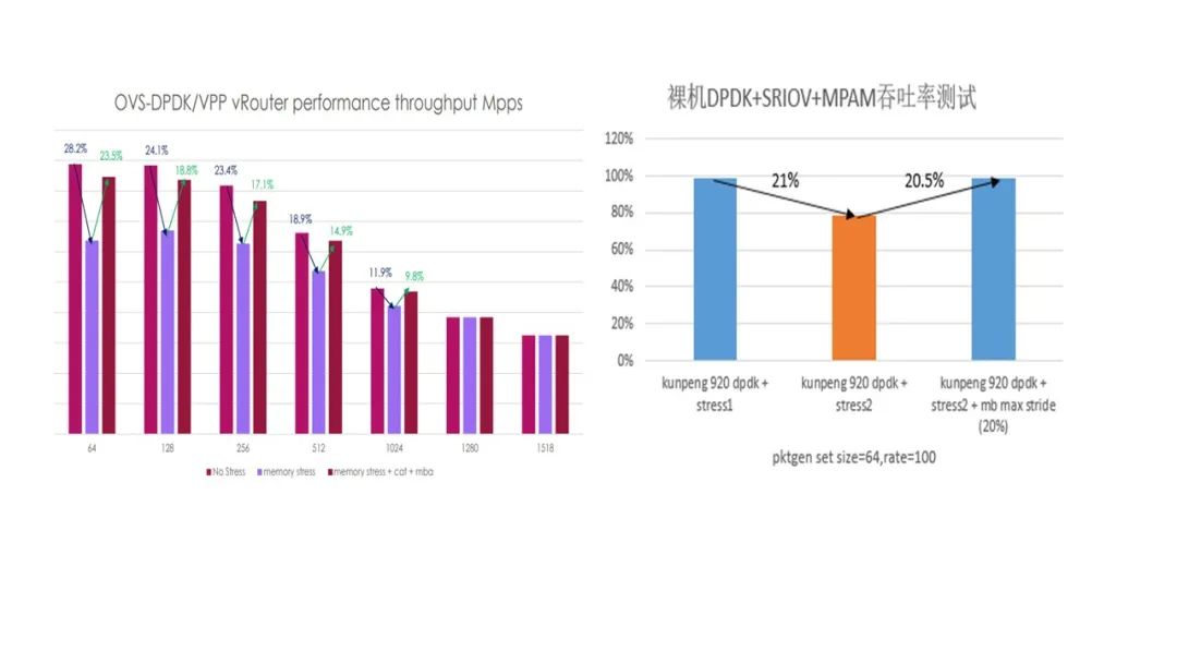 如表 1 所示,可知加压后导致性能退化 22%左右,加压参数参考[9],使用 MPAM 限制压力程序 20%带宽,DPDK 性能恢复正常。