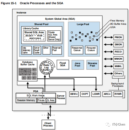 图15-1显示了使用专用服务器连接的系统全局区域(SGA)和后台进程。对于每个用户连接,客户机进程运行应用程序。这个客户机进程不同于运行数据库代码的专用服务器进程。每个客户端进程都与自己的服务器进程相关联,服务器进程有自己的程序全局区域(PGA)。