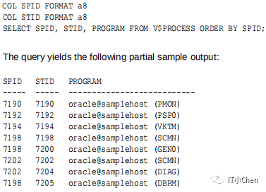 V$PROCESS视图包含连接到数据库实例的每个Oracle进程的一行。例如,您可以在SQL*Plus中运行以下查询,以获得每个进程的操作系统进程ID和操作系统线程ID: