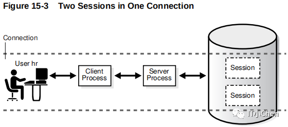 图15-3演示了一个案例,其中用户hr有一个到数据库的连接,但是这个连接有两个会话。