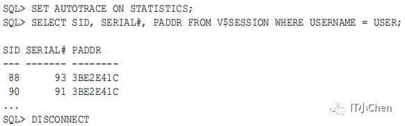 DISCONNECT命令实际上结束了会话,而不是连接。打开一个新终端并以另一个用户的身份连接到实例,下面的查询显示地址为3BE2E41C的连接仍然处于活动状态。