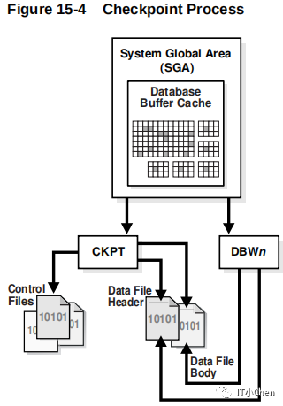 检查点进程(CKPT)使用检查点信息更新控制文件和数据文件头,并向DBW发送将块写入磁盘的信号。检查点信息包括检查点位置、SCN和开始恢复的在线重做日志中的位置。