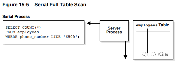 并行执行与串行执行形成对比,在串行执行中,单个服务器进程执行SQL语句的顺序执行所需的所有处理。例如,为了执行完整的表扫描,例如SELECT * FROM employees,一个服务器进程执行所有的工作,如图15-5所示。